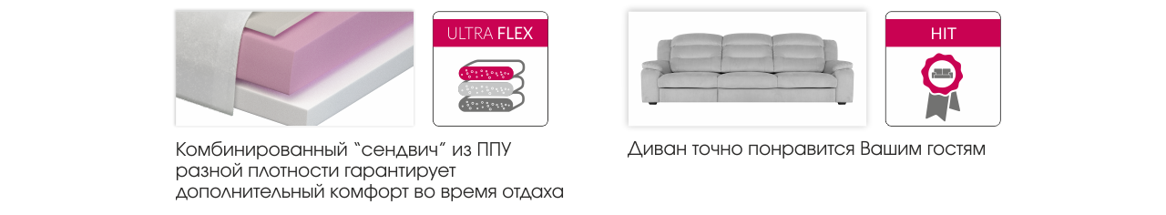 | Наполнение сидений | Elastic base (пружинная змейка, Ultra flex ("сэндвич" из высокоэластичного ППУ дифференцированной мягкости), Холлотек) |
