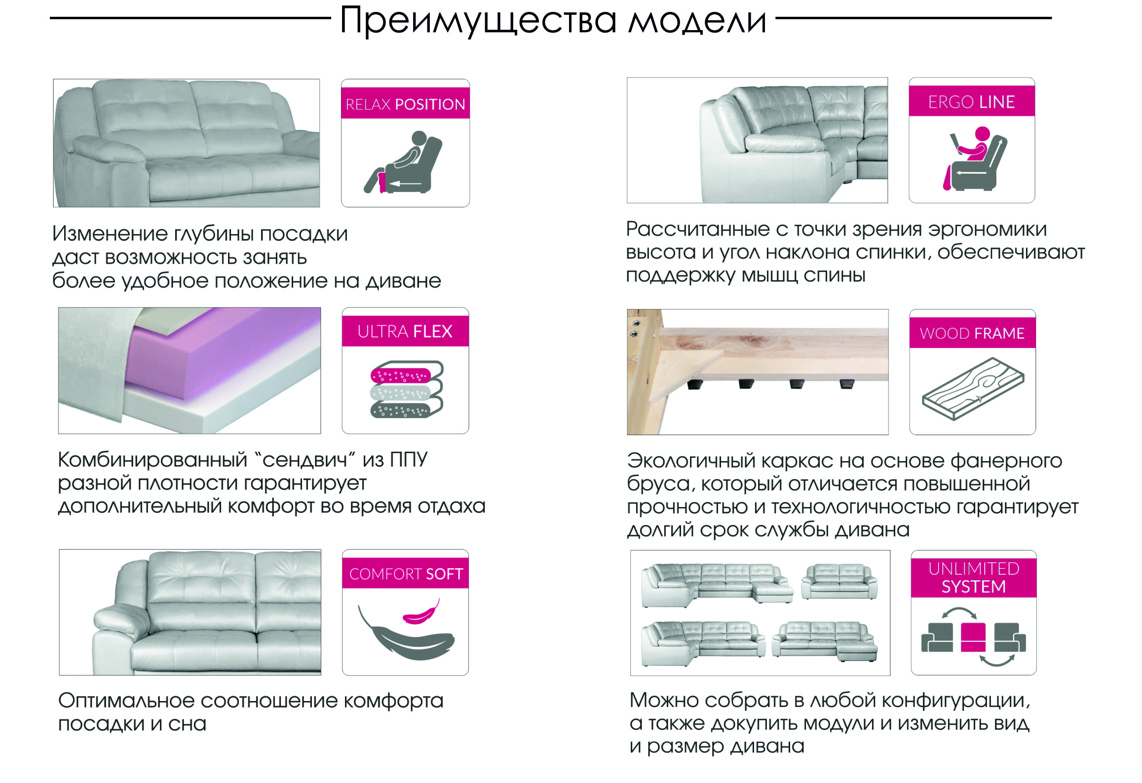 | Наполнение сидений | Elastic base (пружинная змейка, Ultra flex ("сэндвич" из высокоэластичного ППУ дифференцированной мягкости), Холлотек) |